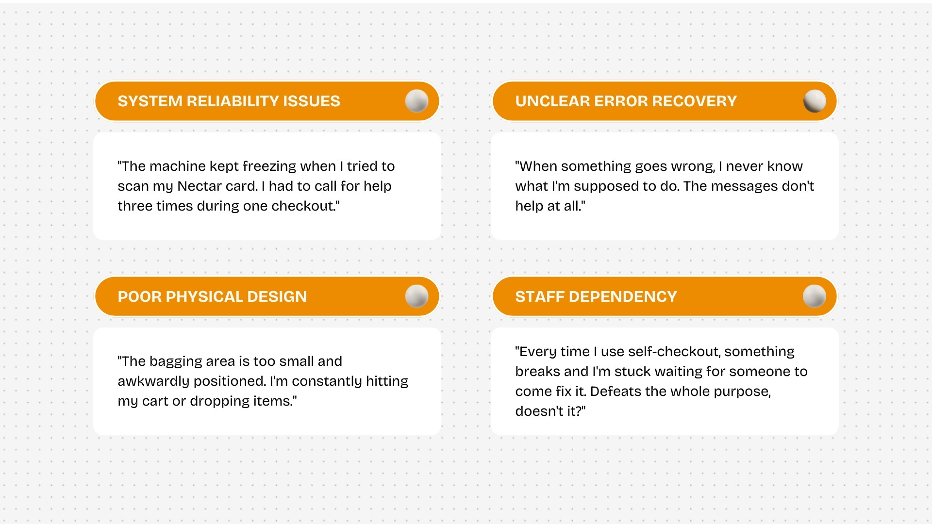 Through observational research at Sainsbury's New Cross Road, I discovered that self-checkout machines consistently failed to deliver on their promise of convenience and speed.